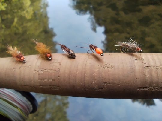 Pour les nymphes j'utilise les mêmes que pour la pêche à la truite. Je fais dans la simplicité, quelques modèles seulement, déclinés en plusieurs lestages et plusieurs tailles. Je choisis parmi les plus gros modèles, rien ne sert d'attaquer les chevesnes avec des micro nymphes. 14/12/10 sont les bonnes tailles.