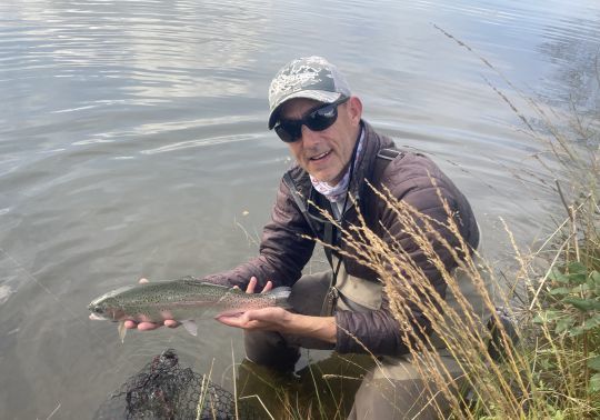Puis, j'ai envie de me balader et d'essayer de trouver des truites dans les bordures. Je n'en verrai que très peu, mais je trouve une zone, dans la partie amont, où des poissons sont « réfugiés ». Elles sont dans peu d'eau, car le lac est bas du fait du manque de précipitations, et je peux les attaquer en sèche. Je monte à nouveau mon imitation de cousin, la fameuse « daddy long legs » en taille moyenne, et pêcherai un peu à vue, mais aussi sur de petits remous. Je ferai monter plusieurs truites dans ces conditions et prendrai du plaisir à les faire monter alors que le reste du lac est toujours calme.