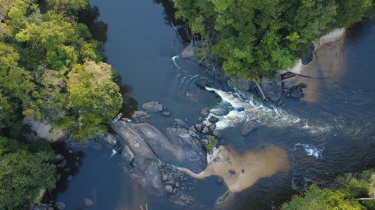 Dans l'eau, c'est une tout autre ambiance. Rien ne laisse présager ce qui se trame en dessous. Le maître absolu ici, c'est l'aïmara. Contrairement aux autres rivières de Guyane qui peuvent héberger des torches tigre, des piranhas voire quelques peacock-bass, ici il y a deux types de poissons : les proies et le chasseur, la machine à tuer par excellence. Embusqués dans les amas chaotiques qui jonchent le fond du fleuve, ils n'attendent que le passage d'une carpe ou d'un petit pacu pour sortir de leurs cachettes. Une proie ou un leurre… Pourvu d'une dentition à faire pâlir n'importe quel poisson d'eau douce, à l'exception peut être du poisson tigre, l'aïmara est un des rares poissons à posséder une membrane qui recouvre la face avant des dents, de sorte que même leurs armes sont camouflées.