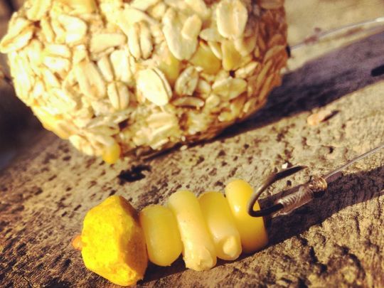 Niveau appât, on est dans la simplicité la plus extrême : pain de mie et maïs doux constituent l'essentiel. Les poissons sont très loin d'être éduqués, donc ce dernier reste la valeur sure. Quelques grains de maïs flottants sont toujours les bienvenus pour adapter la présentation des esches. Ça ne prend pas de place et ça peut sauver. Si besoin d'amorcer plus massivement, ou si je souhaite pêcher à une distance qui ne permets pas d'envoyer les graines à la main, je reviens sur ma recette du Canada : flocon d'avoines, maïs doux et crème de maïs pour faire le liant. Une boule sur le plomb et vamos !