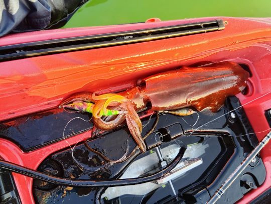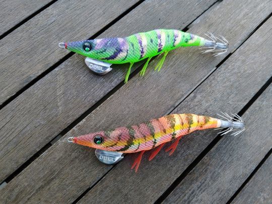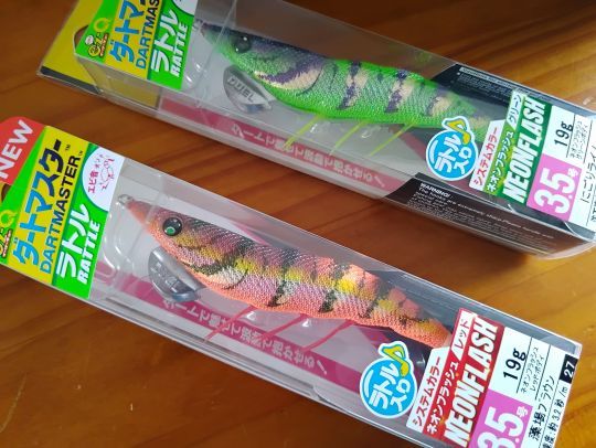 Les EZ-Q Dartmaster Rattle sont des turluttes avec une très belle finition. J'ai pu faire une session ce matin et les conditions étaient marée descendante avec un coefficient de 98. Avec les pluies des derniers jours, l'eau était verte et turbide. J'ai commencé ma session avec mon montage Tataki habituel. Une seule seiche en presque une heure de pêche. J'ai alors remplacé ma turlutte du bas par cette Dartmaster en couleur verte, animation rapide en tapant le plomb sur le fond et en jerkant plusieurs fois pour faire tinter les billes bruiteuses. Plusieurs calamars dont des jolis et deux seiches viendront se piquer durant l'heure suivante.