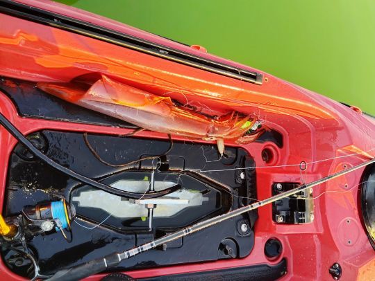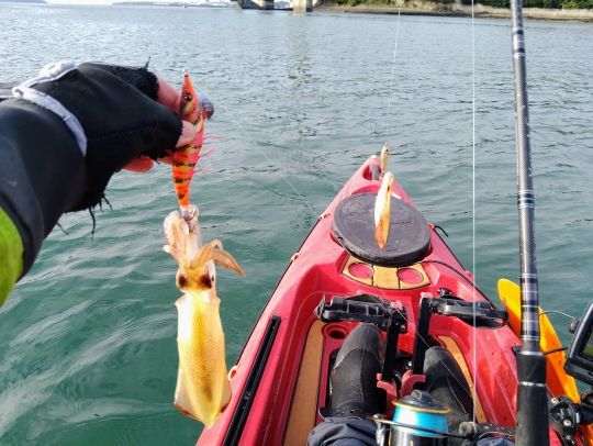 Même montage mais comme l'eau est plus claire, j'ai changé la couleur des turluttes, j'ai pris une tendance orange. Là aussi les calamars sont bien présents. Pas de gros comme sur la première journée mais en nombre, une bonne vingtaine en moins de trois heures de pêche, avec quelques doublés. Et trois seiches qui ne sont pas montées dans le kayak. J'ai refait ma décoration et collé dans le kayak une décoration imitation bois. Je le montre dans la vidéo jointe. J'ai réussi à ne pas faire une seule tache d'encre au cours de cette session, un exploit…