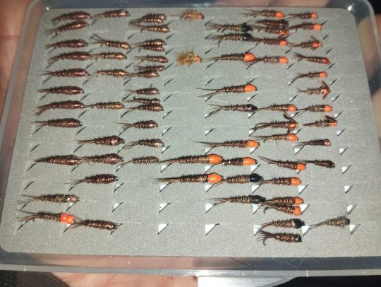 Cela peut également fonctionner sur les nymphes à billes. Si jamais il vous arrive d'ajouter des tours de plomb en plus de la bille afin d'obtenir une imitation encore plus lourde. De cette façon, vous pourrez distinguer facilement les nymphes avec billes pour unique lestage de celles qui comportent billes et tours de plomb.