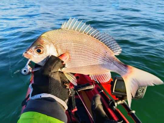 En fonction des courants de marée, j'utilise des tenyas de 30 à 60 grs, en gardant le principe de pêcher le plus léger possible, tout en gardant en permanence le contrôle du tenya. Il faut absolument éviter que la ligne prenne du ventre. Je pêche sous le kayak, en vertical et je laisse la ligne prendre un angle de 30 degrés maximum tout en suivant du coin de l'œil la topographie du fond. Le tenya devant coller à celui-ci le plus près possible. C'est pour cela que cette technique décourage pas mal de pêcheurs, préférant utiliser des kabura qui eux sont animés au dessus du fond et donc moins de perte de matériel. Avec un peu de persévérance et quelques accroches au fond, cette technique s'avère redoutable et intéresse bien souvent de jolis poissons.