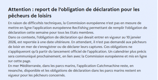 Le COPERE prend acte du report officiel de l'obligation de déclaration des pêcheurs de loisir en mer via l'application européenne RecFishing, annoncée comme obligatoire à partir du 10 janvier 2026. Après des mois de communication, de campagnes financées par l'argent public, et de pression exercée sur les pêcheurs de loisir, l'administration reconnaît aujourd'hui une évidence : l'outil n'est pas disponible.