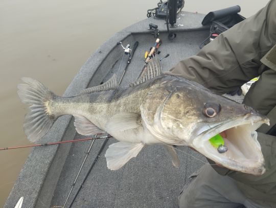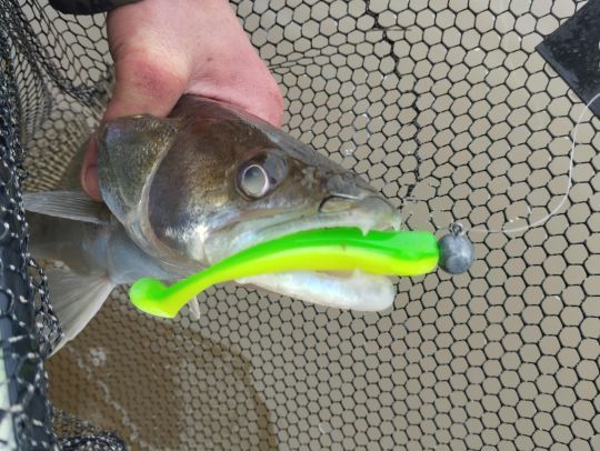 C'est en essayant la nouveauté Fiiish que nous allons monter le premier sandre à bord. Ce Pit swimmer en coloris flashy Atomic citrus semble plaire aux sandres aujourd'hui. Touche de qualité et leurre avalé nous le prouvent.