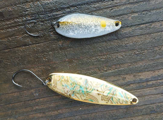 Côté cuillers quelques nouveaux coloris pour les ondulantes. C'est un leurre qui revient un peu à la mode. Surtout en mode mini pour les truites arc-en-ciel. En grosse taille (11 g) elles ont l'avantage de se lancer très loin. Le revêtement est solide et saura résister aux dents des truites.