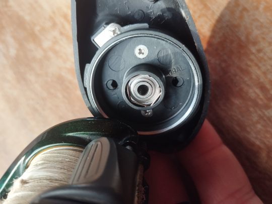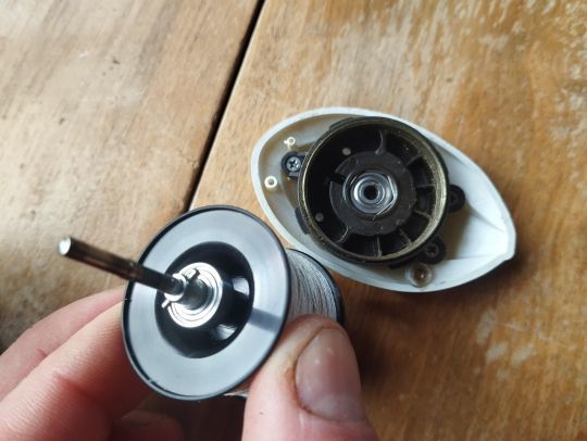 Pour le roulement situé coté manivelle, il faut desserrer entièrement le capot du frein de bobine. Sur ce modèle il passe juste entre les pales du frein, il n'y a donc rien à démonter. Attention, il y a un ressort sous ce capot. Vous avez ensuite accès directement au roulement qui est de même dimension que l'autre, à savoir 3x10x4.