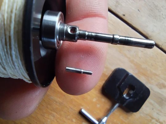 Le roulement de gauche est fixé directement sur l'axe de la bobine et il faut donc enlever celle-ci pour y avoir accès. Il est maintenu par une goupille métallique. C'est grâce à l'outil spécifique que l'on peut la retirer et ainsi accéder au roulement. Celui ci a pour dimensions 5x11x4.