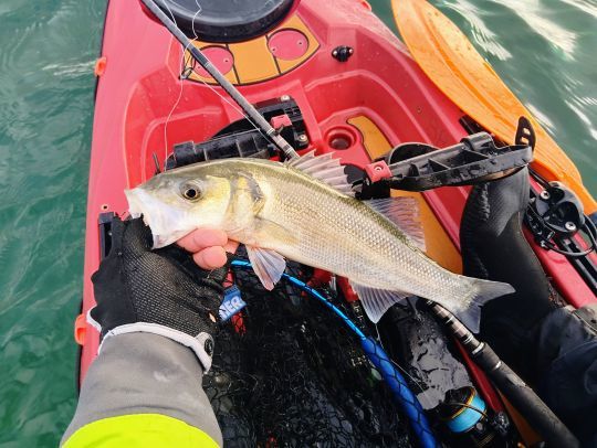 J'essaye d'abord avec un Deep Diver couleur nacrée en 90 pour prospecter la zone la plus profonde, pas une touche… Je passe alors sur un poisson nageur qui évolue dans une hauteur d'eau de 2 à 3 mètres. Mon habituel 3DB Jerkbait 110 SP, j'ai choisi une couleur dos ayu, ventre blanc. Je me rapproche un peu plus du plateau, il doit y avoir 4 mètres de fond environ. Bonne pioche, je ferai 3 poissons à suivre, pas des monstres, des poissons de 42, 41 et 41, tous repartis nager. Je suis content d'avoir validé mon choix par des prises, même modestes. La saison bar 2026 est lancée.