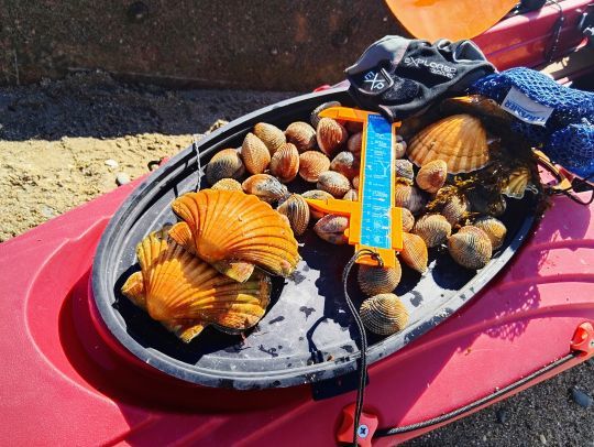 Pendant ce temps-là, la marée a continué de descendre et je vais pouvoir poser le kayak sur l'estran. Priorité aux praires et aux coquilles. Toujours sur mes coins habituels, je commence par les praires. Pour rappel, la maille pour ce coquillage est à 4,3 cm et le quota est de 100 individus ou 3 kg. J'en prélève assez vite une cinquantaine de belles tailles puis passe à la promenade dans les mares pour les coquilles. Cette année, nous n'avons pas eu le problème de toxines ASP sur ce coquillage. Chez nous, la maille est à 11 cm et le quota de 30 individus en pêche à pied, 15 en plongée apnée. Comme il fait beau et qu'il n'y a pas trop de vent, en se baladant dans les mares, on peut les voir assez facilement, avec un peu d'habitude.