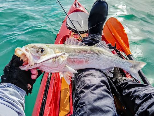 En revenant vers mon point de départ, les deux derniers seront mesurés à 51 et 52 cm, c'est mieux. Il est 11 h 00, j'arrive sur une zone plus profonde dans ce que l'on appelle le champ d'algues. C'est une zone où il y a une culture d'algues destinées à la cosmétique et où il y a des cages d'engraissement d'ormeaux d'élevage. Le vent est toujours assez fort et la mer est un peu formée. Je décide de cheminer entre deux rangées de bouées, je sais qu'il y a une dizaine de mètres sous le kayak. Pour cette zone, je suis passé sur un leurre travaillant dans la profondeur des 4 mètres. Un Deep Diver 90 en couleur blanc nacré, toujours de chez Flashmer. J'essaye de rester nez face aux vagues en remontant les lignes de bouées et là, c'est la cartouche dans le bras, celui-là est plus joli. Il m'offre un joli combat. Je dois travailler le poisson, tout en conservant ma ligne de navigation. Il faut éviter de se mettre en travers tout en évitant de trop se rapprocher des lignes de bouées. Merci le steppe et la commande de gouvernail qui répond bien. Je le mets à l'épuisette au premier essai. Le poisson affiche 62 cm à la toise, c'est bien mieux.
